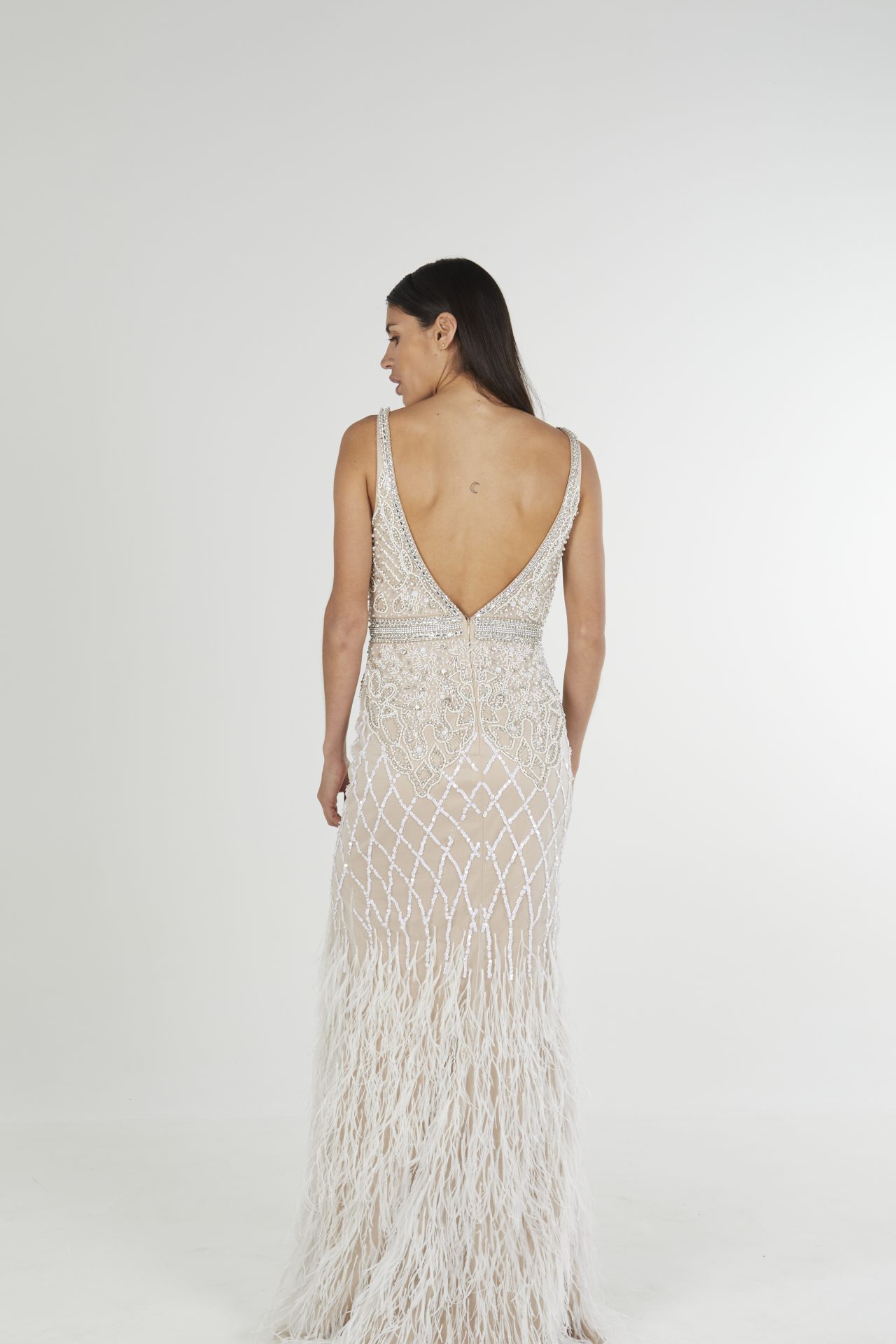 Vestido de tul bordado con incrustaciones de canutillos, piedras y perlas, con lentejuelas bordadas en la falda y detalles en canutillos y strass en cintura y breteles y plumas en la parte inferior.