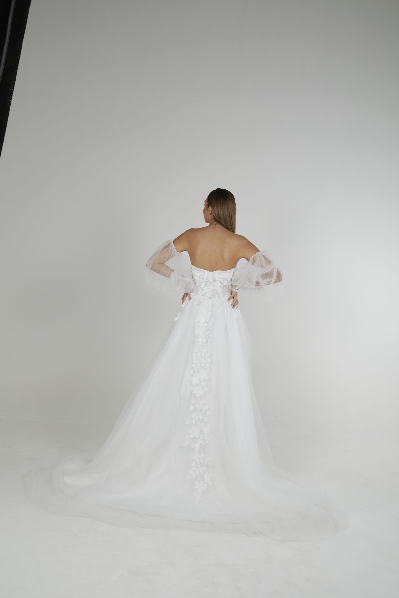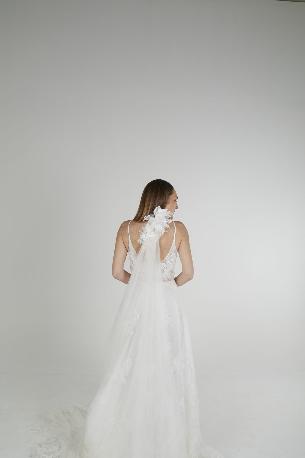 Vestido de novia de tul con apliques de hilos de seda italiano, con falda en capas y cola.