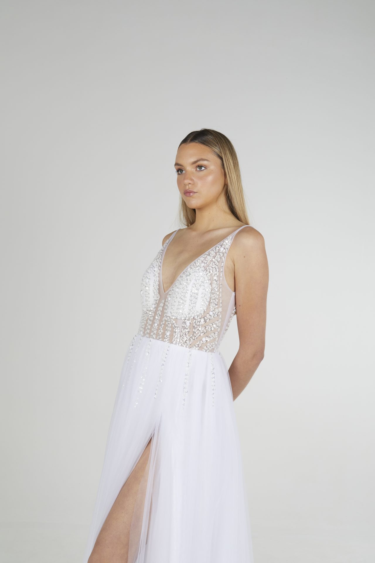 Vestido de tul bordado a mano con lentejuelas y tajo izquierdo.