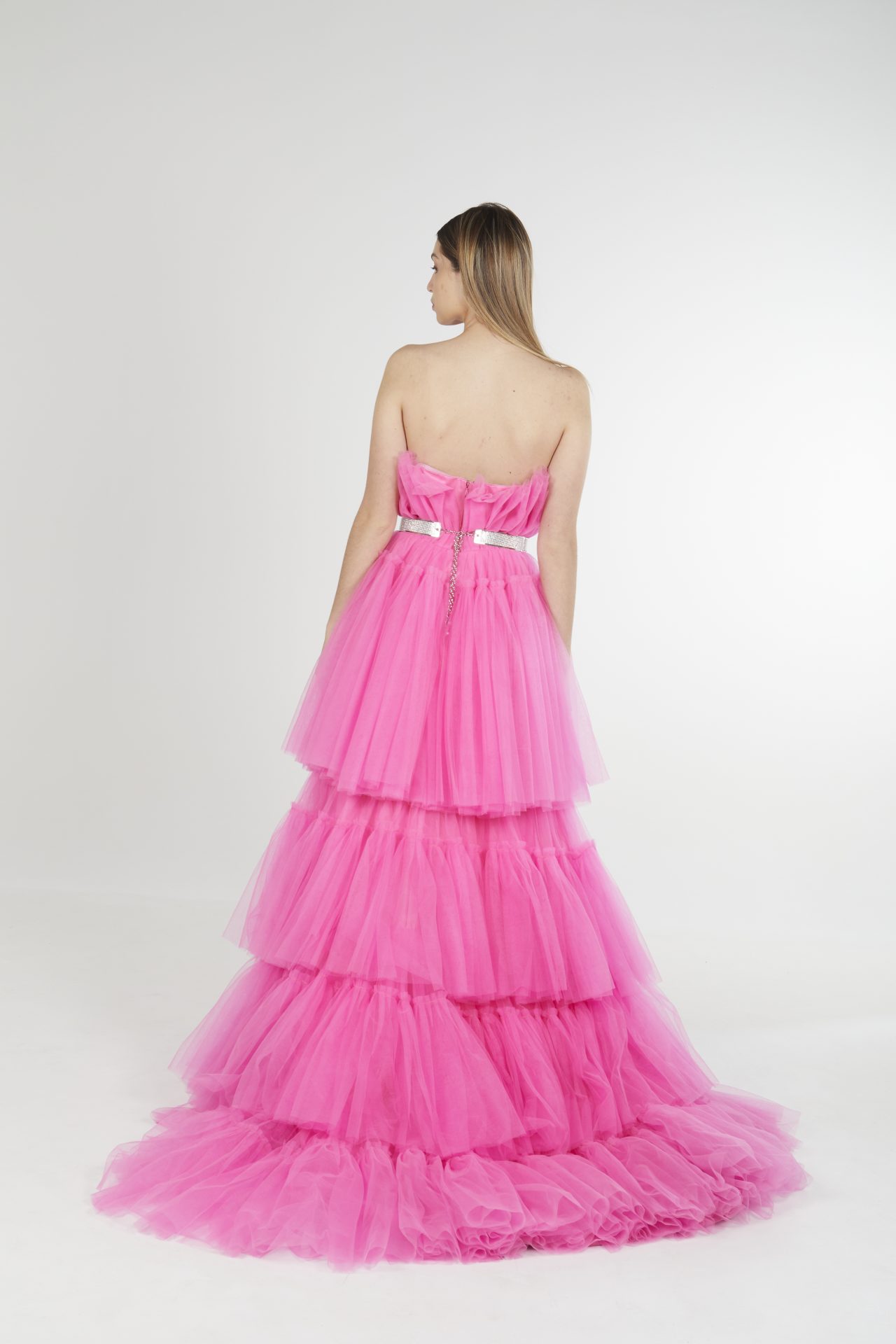 Vestido de tul plisado, con cola desmontable.
