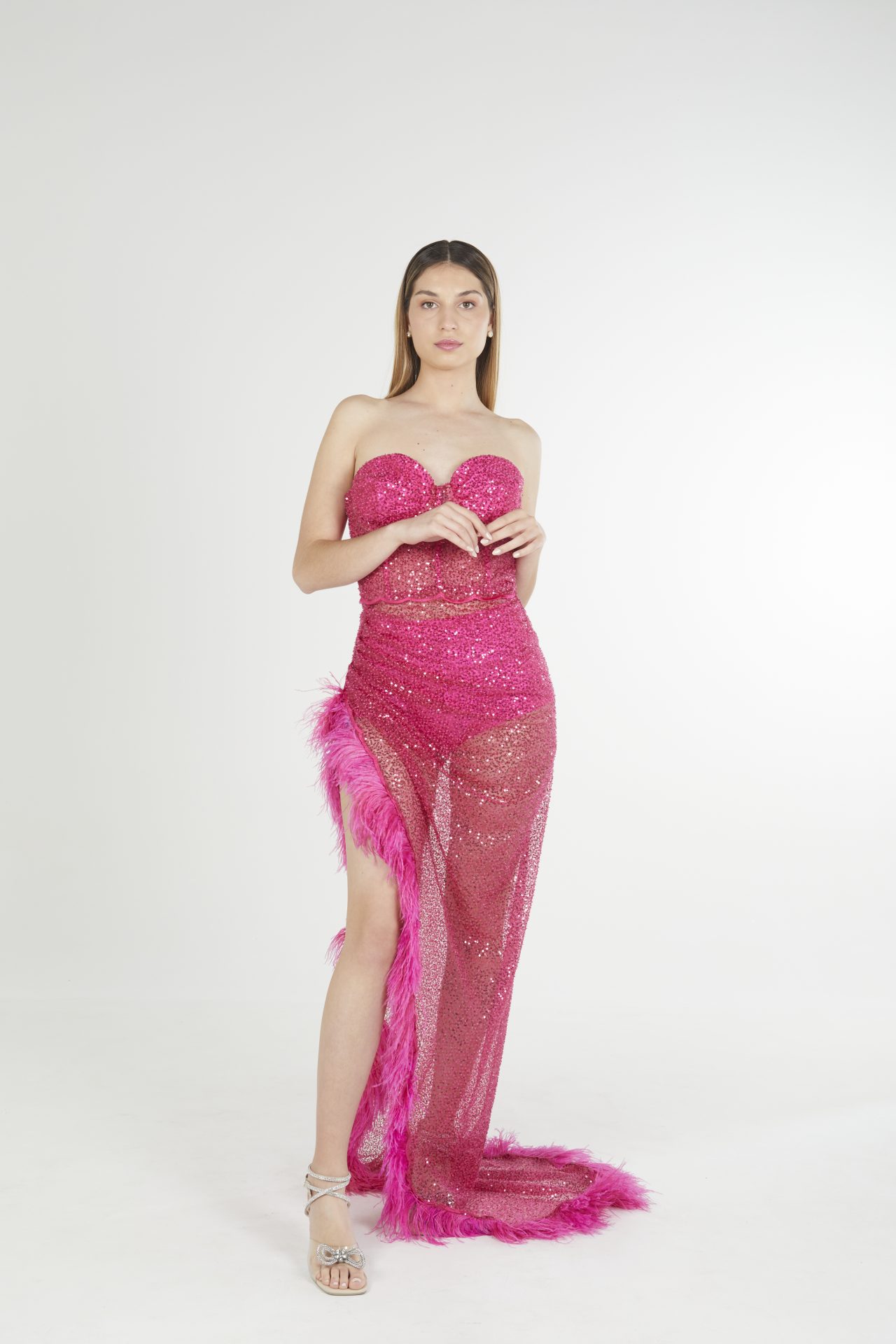 VESTIDO BARBIECORE EN TUL BORDADO CON MOSTASILLAS Y LENTEJUELAS CON FALDA Y COLA, CON PLUMAS