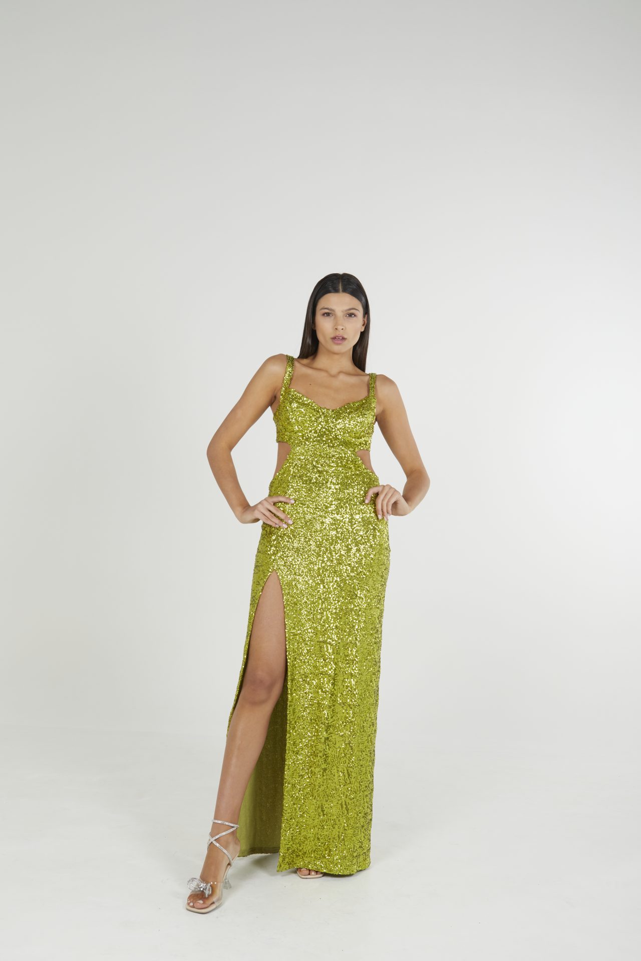 Vestido cut out de tul con lentejuelas bordadas y tajo.